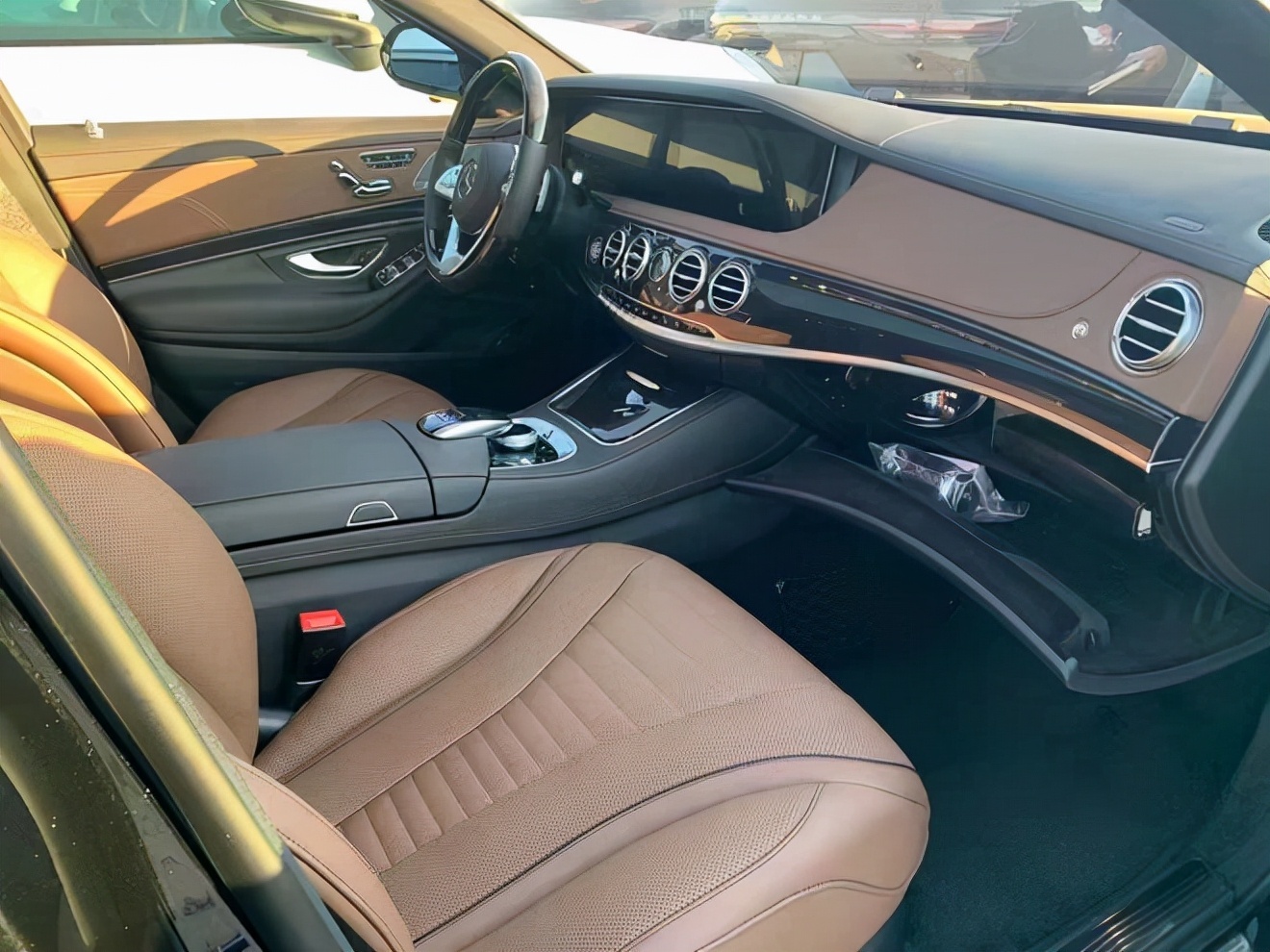 20款奔驰S560内饰,提供64色带有10种主题的氛围灯和大面积的全新木纹装饰。带有触控键的三辐式方向盘,搭配一体化设计的双12.3寸高分辨率显示屏,科技氛围浓重,并且前、后排均设有手机无线充电功能。此外,新车还配备“道路追踪套装”,并可选装“新一代智能驾驶辅助套装”、“避让转向辅助系统”以及“基于路况的主动式速度限制辅助功能”。