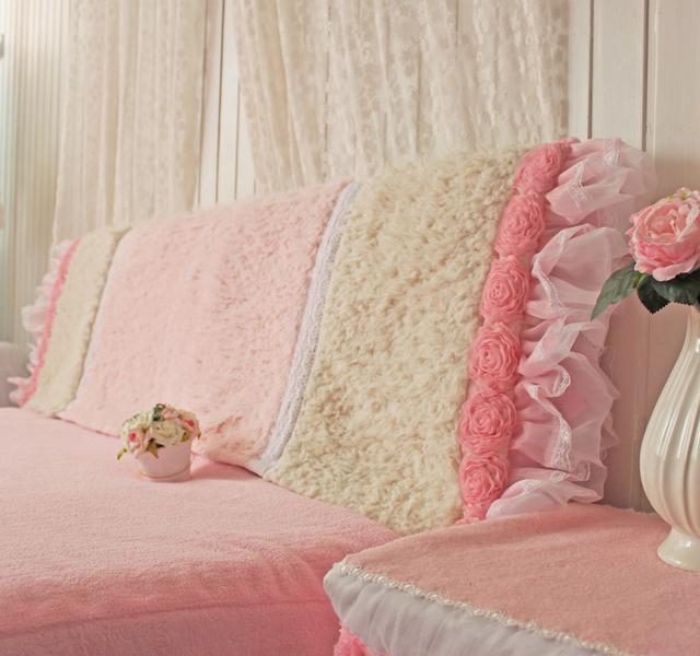 粉色羊仔绒与米白色羊仔绒拼接,精美粉色蕾丝花朵以及荷叶蕾丝纱封边,完美展现给您一个全新的床头。