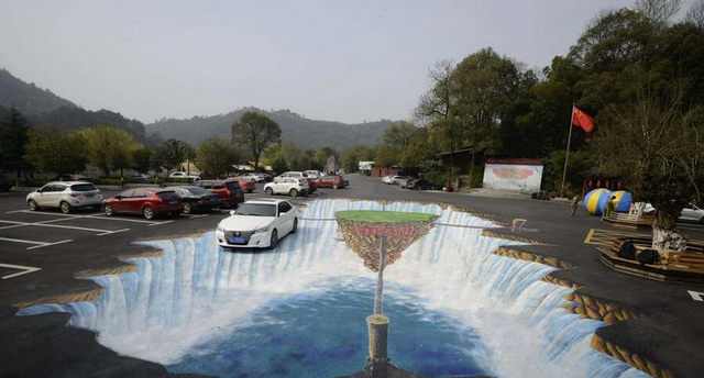 停车场停车是一件很平常的事情,但是这家停车场的地面装饰非同一般,地面上竟然制作了一幅500平方米的3D画作。这瀑布画面太逼真了,吓坏了不少停车的司机朋友!