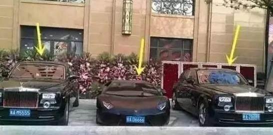 这是安徽的一个停车场,里面停的全是百万级别豪车,可以看到两辆劳斯莱斯幻影的中间停了一辆兰博基尼,挂着的车牌号都是连号的,左边的车是4个5,中间的是4个6,最右边是4个8。