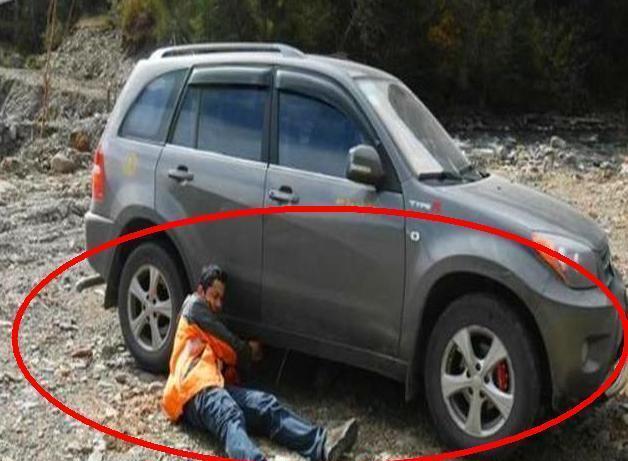 如果车上没有千斤顶,而在路上又遇到了爆胎,尤其是在自驾游远行的途中,那么该怎样换胎呢?接下来就介绍一种方法给大家, 换车轮胎,首先就要想办法让车胎离地悬空,这时候需要准确的找到受力点,然后支撑起来。一般汽车底盘受力点可以选择车胎一侧的前保险杆。