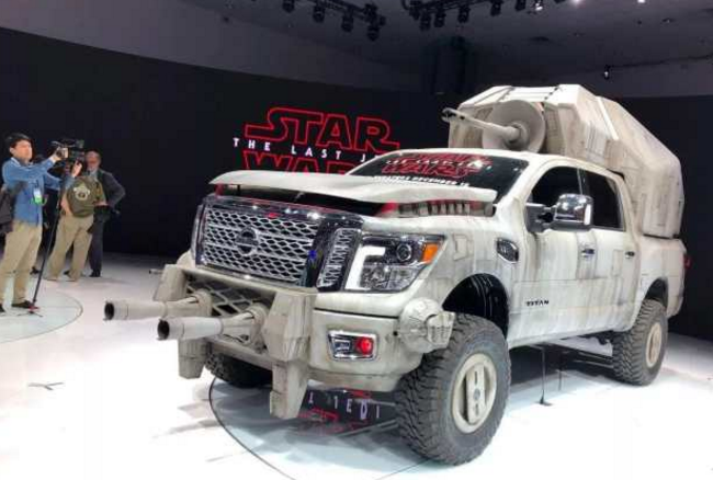 在2017年的洛杉矶车展上,日产汽车又一次与卢卡斯电影公司联手,推出了以“星球大战”为主题的概念车系列。其中,最引人注目的莫过于颇具未来感的“武装皮卡”——日产TitanAT-M6,这款定制版日产Titan是所有电影定制版车型中最精致的一款车。