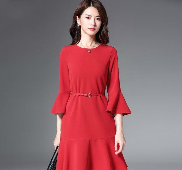 简约又富有设计感的微喇叭袖的设计,能让手腕更加纤细,尽显女性柔软慵懒的气息,让女性更加温柔,宽松的版型具有极好的瘦身效果,裙身做了收腰的设计,再搭配高跟鞋,凸显出女性迷人得身材,让女性极具女人得独特魅力。