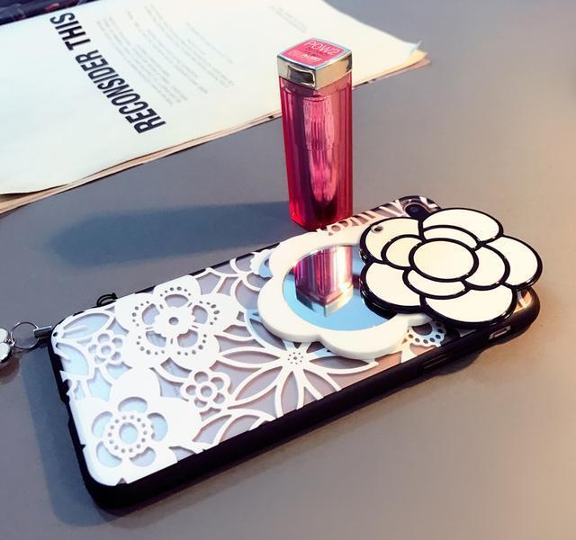 漂亮的山茶花图案的手机,背面的山茶花还另藏玄机,如果我们出门在外,害怕自己的妆花也没有小镜子,这个隐形的小镜子解决你的问题。