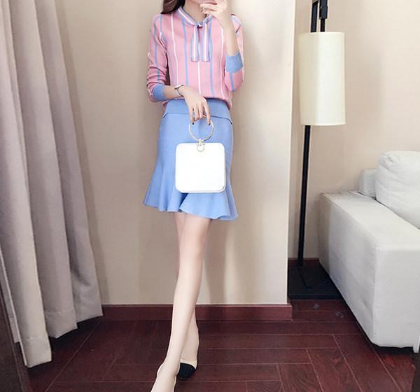 亮眼的糖果撞色拼接让这款时装套装散发着浓浓的少女风气息,减龄效果满满;包臀的设计又有着一丝的性感韵味,勾勒出曼妙的好身材;荷叶边裙子让你走起路来更加灵动俏皮,吸引众人目光,下面穿尖头半高跟鞋,非常显高。