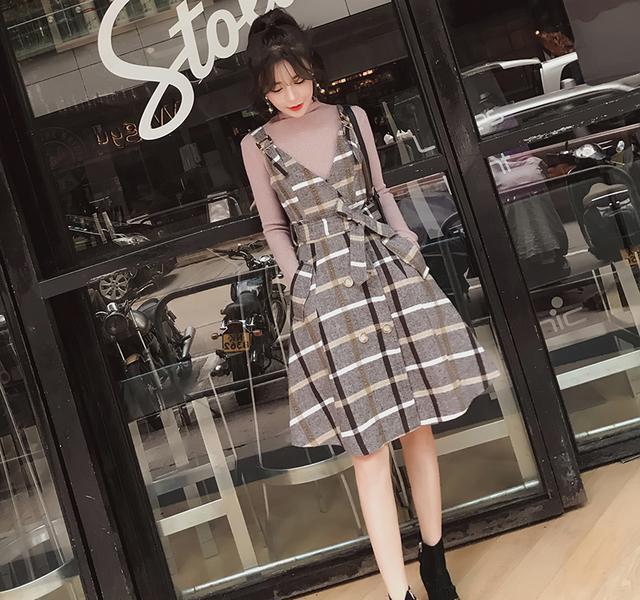 超美的一款两件套装裙,气质立体修身版型,时尚显身材,毛呢背带裙,看着就很温暖,搭配透视针织衫,显露出小女人的性感妩媚。
