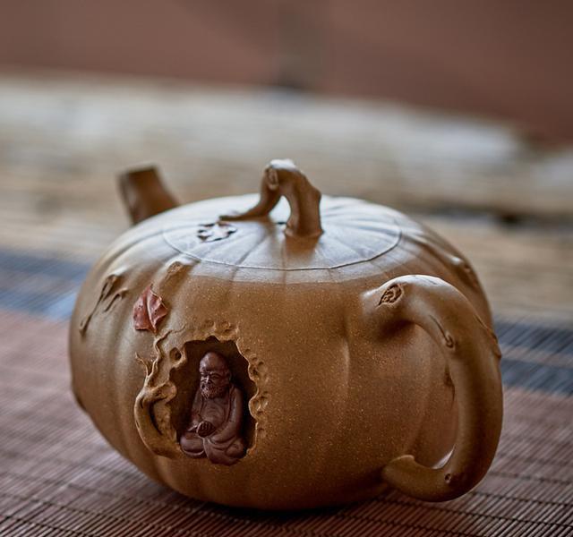 禅意,一个包含着无限憧憬的词语。以禅意为魂,紫砂为体,成就了这一款秋日枯禅紫砂壶。外形看起来如南瓜样,壶身上,雕刻有达摩悟禅图,斑驳的纹理点缀,更显紫砂壶的神韵。