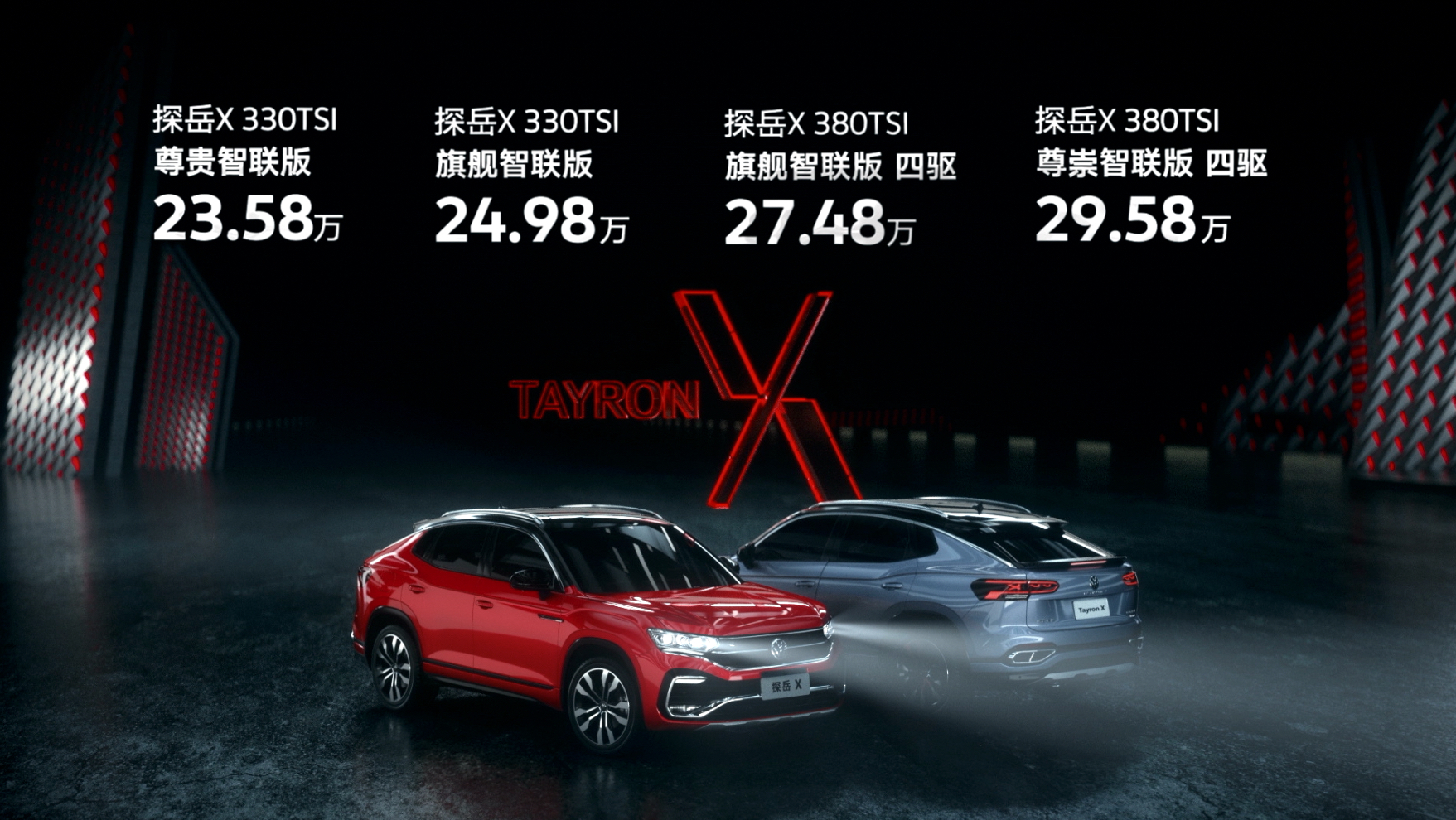 7月17日,一汽-大众大众品牌首款Coupe SUV——探岳X上市,共推出4款车型售价23.58万-29.58万元。主打年轻运动,全系标配R-Line套件,而且新“R”标识来自于R部门。搭配中高两种功率的2.0T发动机,匹配7速双离合变速箱,高配两款还有四驱加持。作为20万-30万元这个区间几乎是唯一合资轿跑SUV,探岳X定位挺精准的。