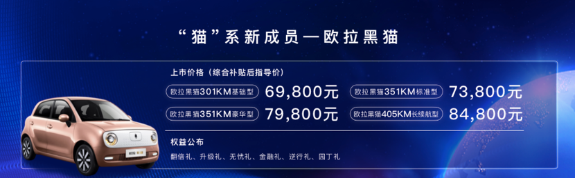 7月24日,长城欧拉多款新车亮相成都车展,其中全新改款的欧拉R1正式上市,并更名为欧拉黑猫。新车共4款车型,厂商指导价为6.98万元-8.48万元,包括405km超长续航里程在内的21项内外升级,全面强化了硬核产品力。正式更名后的欧拉黑猫,也将与搭档欧拉白猫继续丰富欧拉“猫系”家族矩阵,真是为吸引年轻人不遗余力。