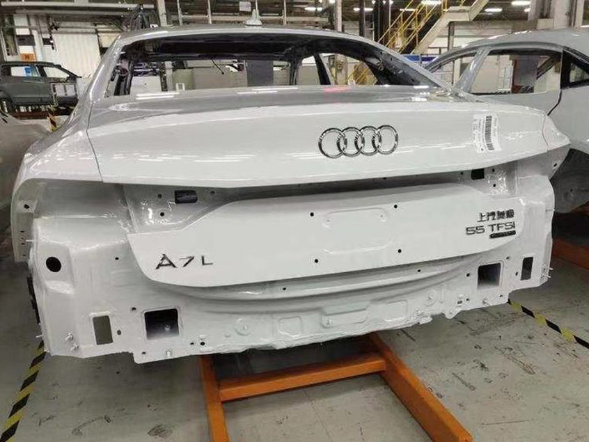 上汽奥迪项目虽然经历了一波三折之后,但如今还是终于落地。近日,上汽奥迪首款国产化车型奥迪A7L的白车身也已经在工厂下线。 从实拍图来看,奥迪A7毫不意外的被加长了,左下角带有A7L标识,而右下角则为55TFSI字样,这也就意味着它搭载的是一台3.0T V6涡轮增压发动机,最大马力340匹,峰值扭矩500牛米。