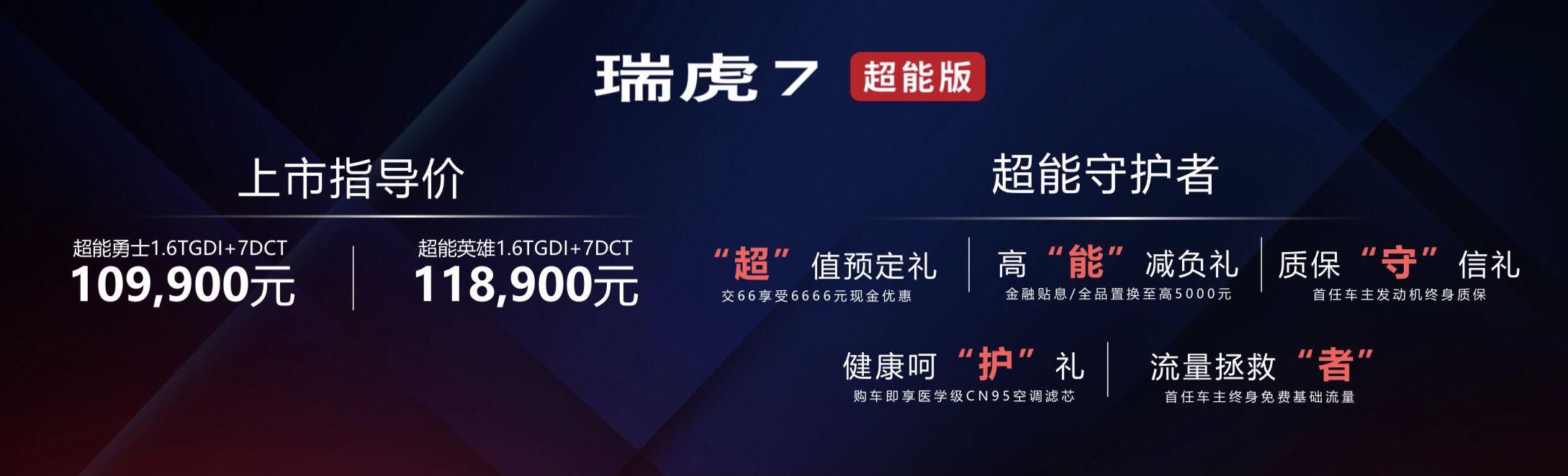 诸葛版,超能版,奇瑞系的车型命名走的正统接地气风格。4月27日,奇瑞瑞虎7超能版正式上市,推出超能勇士版10.99万元、超能英雄版11.89万元。新车型采用了奇瑞鲲鹏动力组合(1.6TGDI+7DCT),最大功率145kW,峰值扭矩290N·m,主打节油与动力的平衡,是此次升级的亮点之一。前脸采用超能几何矩阵钻石前格栅、高亮黑守护者进气边框、红色装饰氛围的加入让整车更有辨识度和立体感。