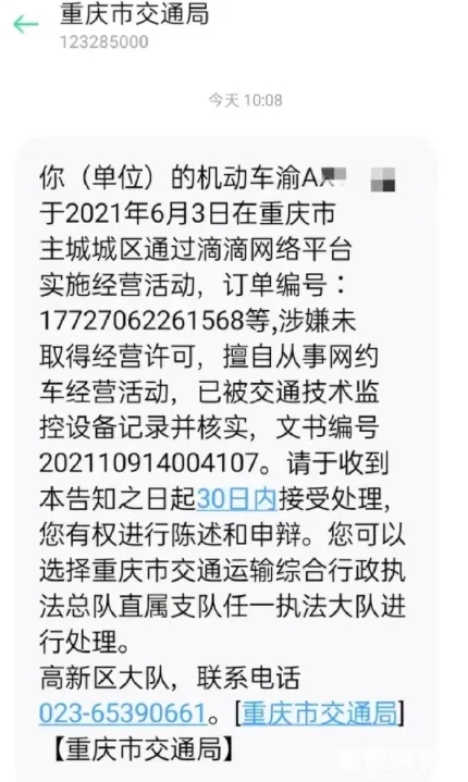 从被罚司机发出的短信来看,大意是:机动车在滴滴平台实施经营活动,未取得经营许可,擅自从事网约车经营活动,需在收到通知之日30日内处理,连订单号都写明了。