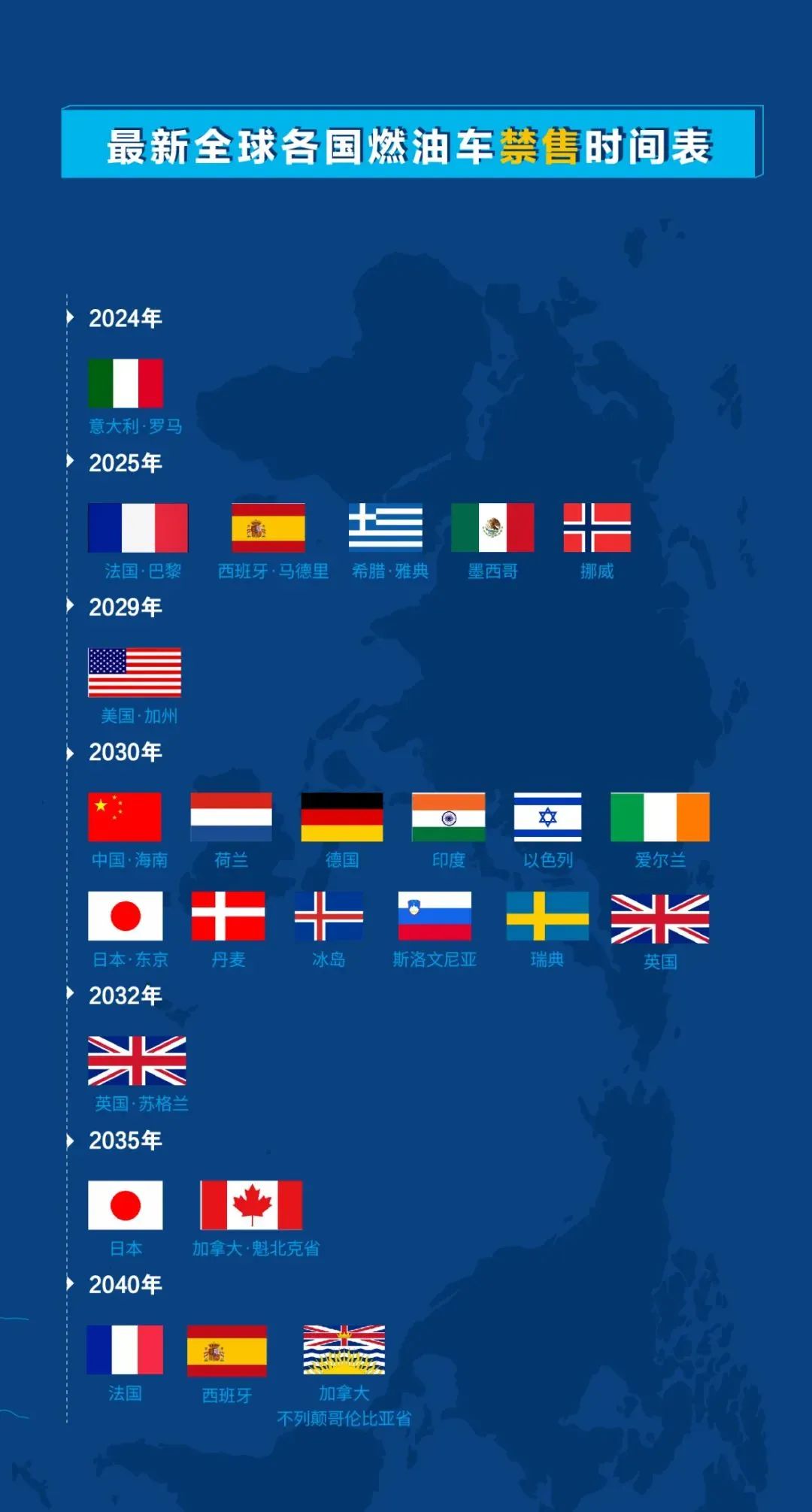 荷兰、挪威、意大利、法国、英国、印度等国家也纷纷推出禁售时间表,时间最早的为意大利罗马的2024年,最晚的是法国的2040年。