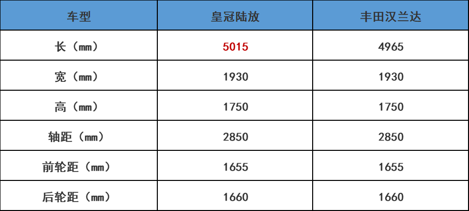 从图表中可以看出,车身尺寸完全一致,只有车长有所区别,那可以确定皇冠陆放是汉兰达同平台差异化的产品,从定价上也可以看出,皇冠陆放预售价格为:28万-37万,而汉兰达的厂商指导价为:26.88万-34.88万。这一波可以说是加价还不加量,话题性拉满。
