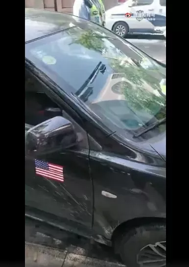 值得一提的是,这辆车不光在后挡风玻璃上贴着日本国旗和支持731部队的标语,该车的车门处,还贴着一面小小的美国国旗。