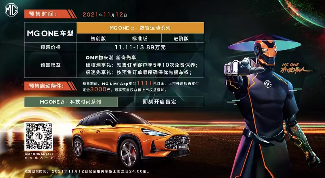 2021年11月12日,名爵旗下全新紧凑型SUV——MG ONE正式开启预售,但因受全球芯片供应短缺及车型芯片差异影响,MG ONE将分期预售、分期上市,本次预售车型MG ONE-α提供初创版,标准版,进阶版三种版本选择,官方预售价为11.11万元-13.89万元。MG ONE-β也开启盲定,将于明年上市。