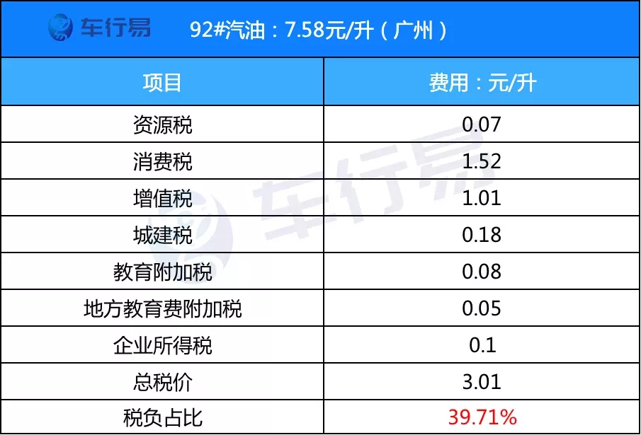 可见,我们平时加7.58元/升的92#汽油,需要缴纳3.01元/升的税费,占比39.71%。