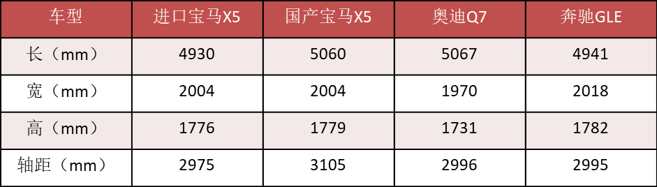 先来说说加长,国产宝马X5长宽高分别为5060/2004/1779mm,轴距为3105mm,长度和轴距均比进口版增加130mm,可能你对这个数据没什么概念,但实际上这个块头已经可以看齐进口宝马X7了,两者的轴距都是3105mm。