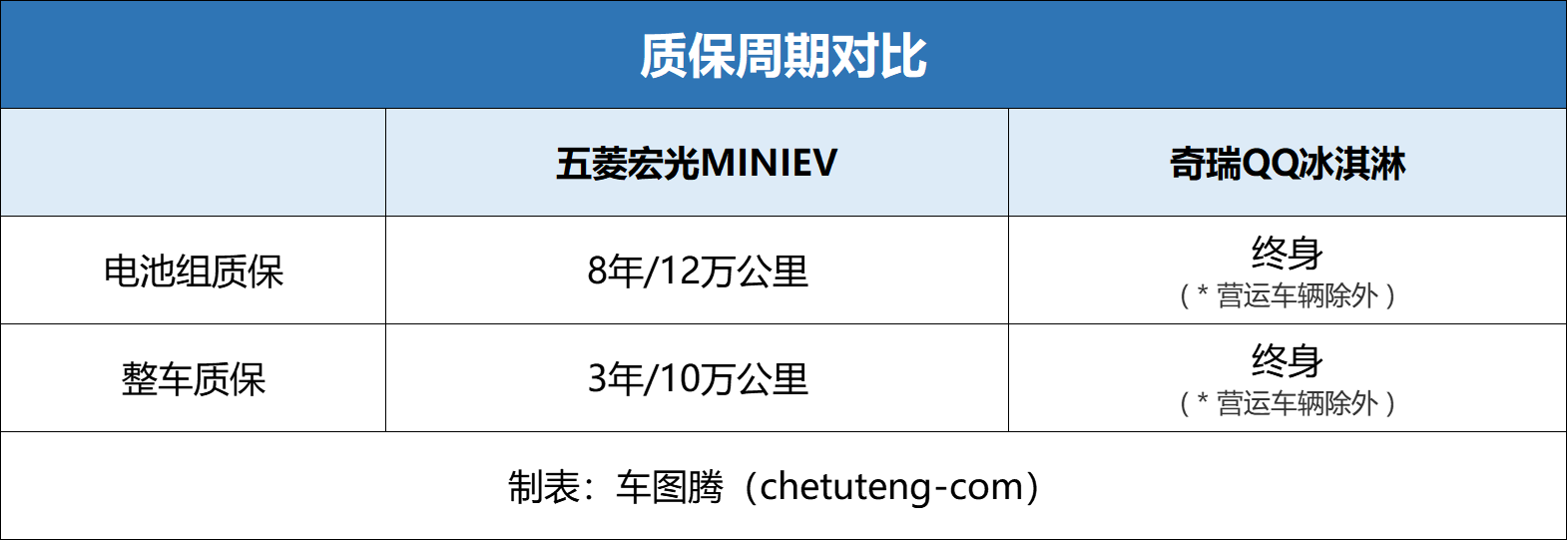 五菱宏光MINIEV的电池组质保周期为8年/12万公里,整车质保周期为3年/10万公里;而奇瑞QQ冰淇淋的电池组和整车都可以享受终身质保(营运车辆除外)。
