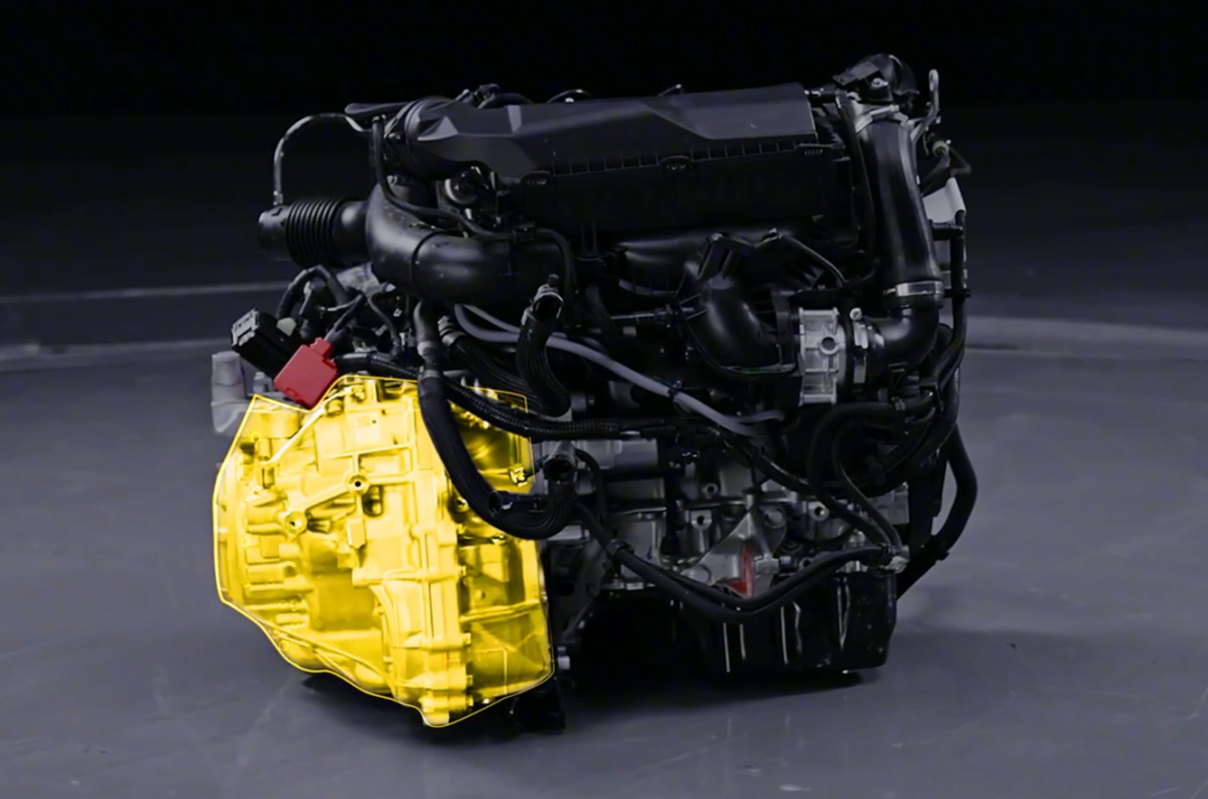 (现款的EP发动机相比初代产品,体积有着非常明显的缩小。黄色部分为爱信8AT变速箱)