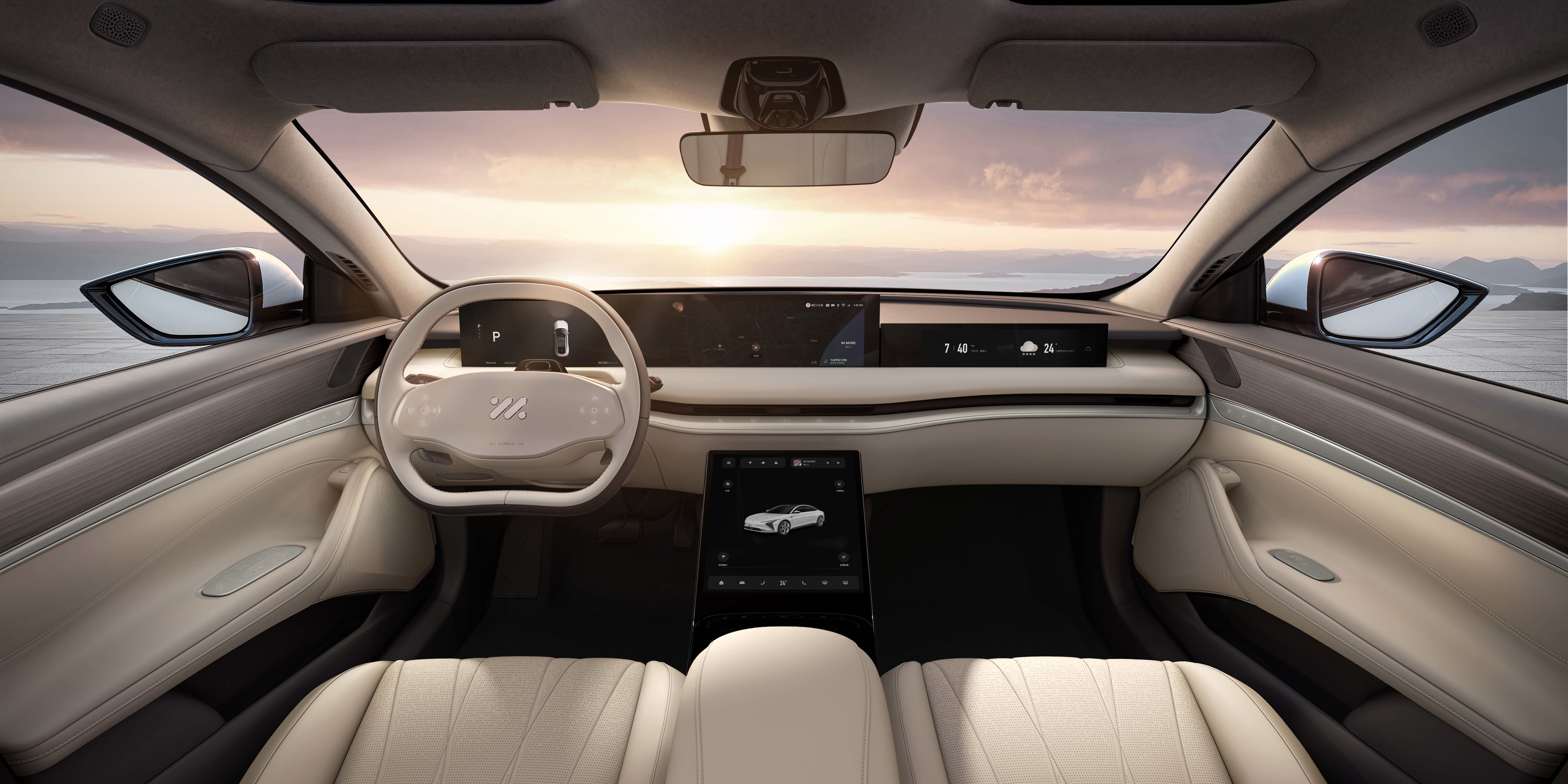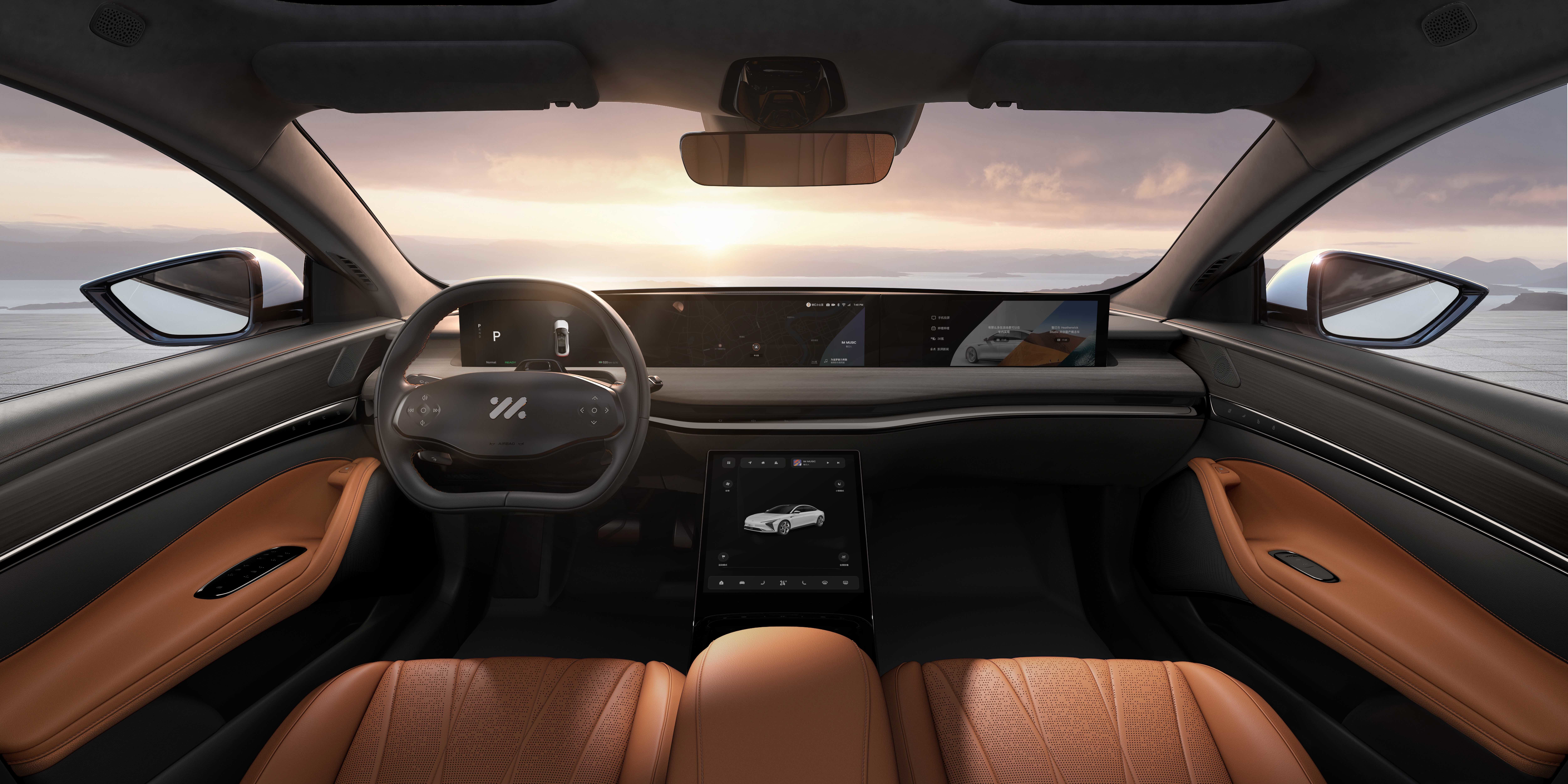 简约科技中营造出的豪华感。很有新能源车的风格,用料也舍得下本。中控台的一体式多联屏采用了类似岚图FREEE的设计,可以整体升降。还支持一些顶级材质的选装。