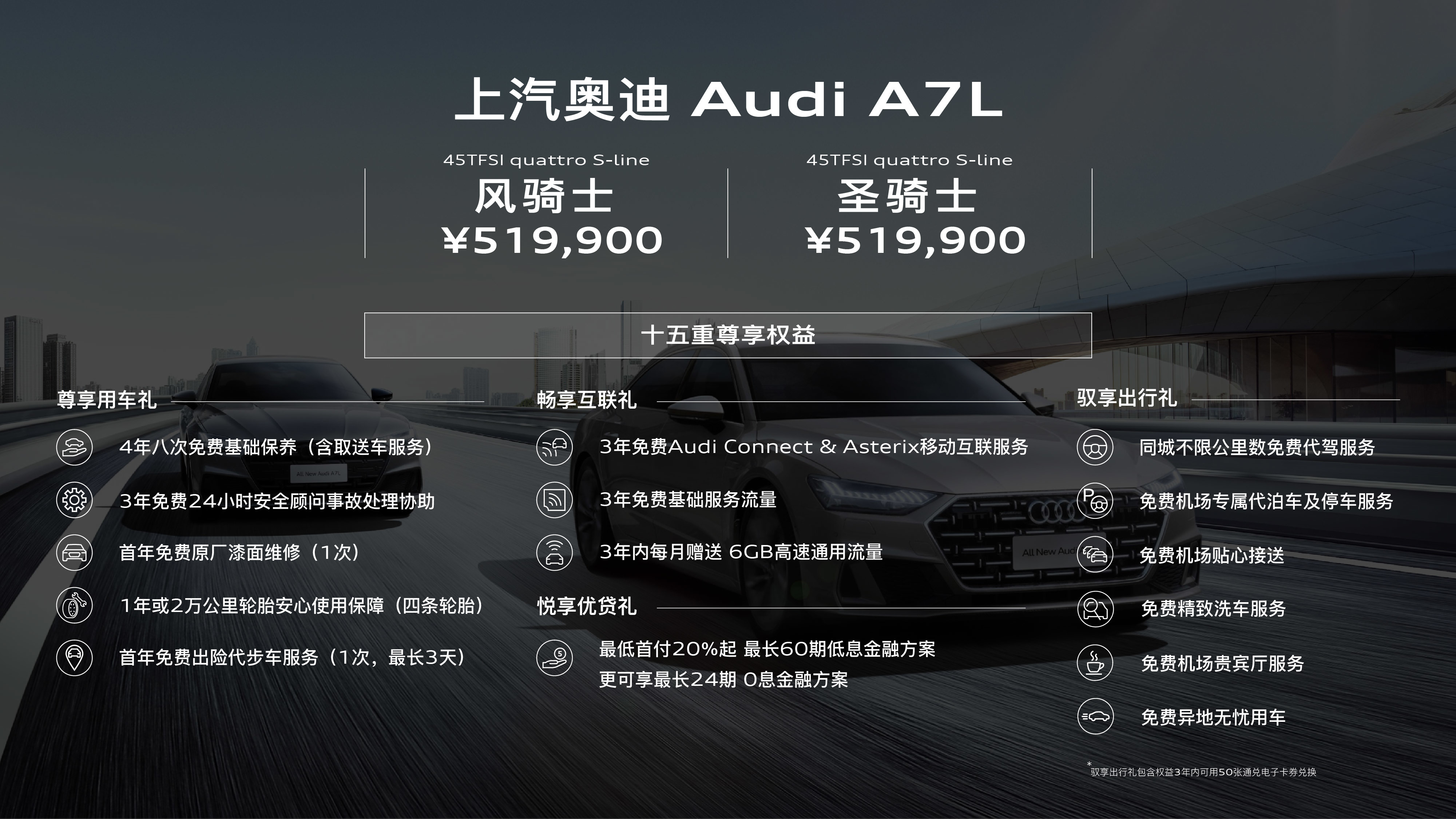 与此同时,奥迪A7L推出了圣骑士版和风骑士版两款新车型,售价均为51.99万元,包含4种配色,并在45TFSI车系15项标配装备的基础上,增加了quattro四驱系统、智能离车泊车、B&O 3D环绕音响、20英寸轮毂、3D全景影像、前排座椅加热等配置。