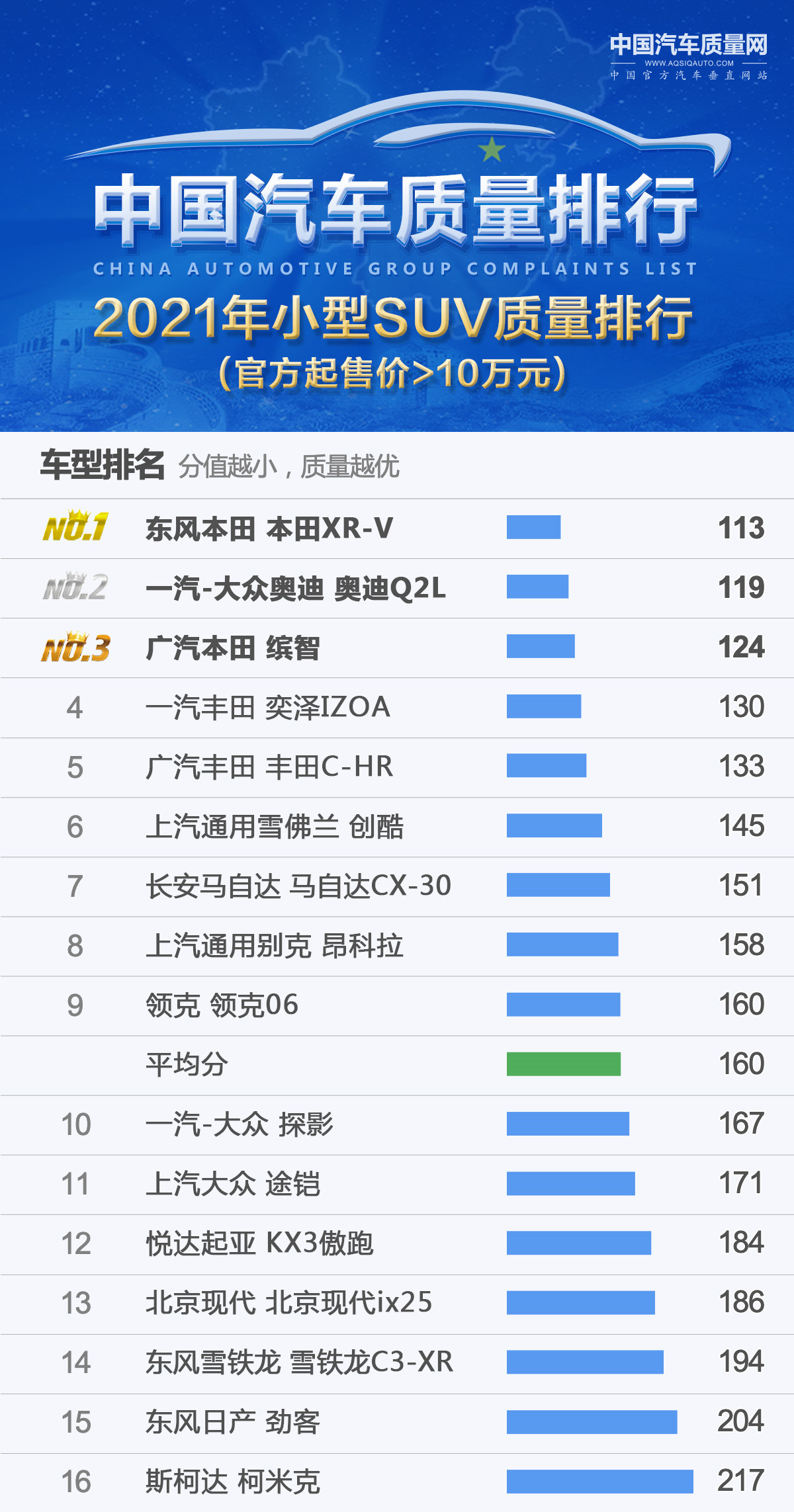 此次,参评的小型SUV共有16款,平均分为160。这份“成绩单”上,分数越小代表车型的质量越好。这其中,有9款车型达到平均分以上,还有7款车型在平均分以下。