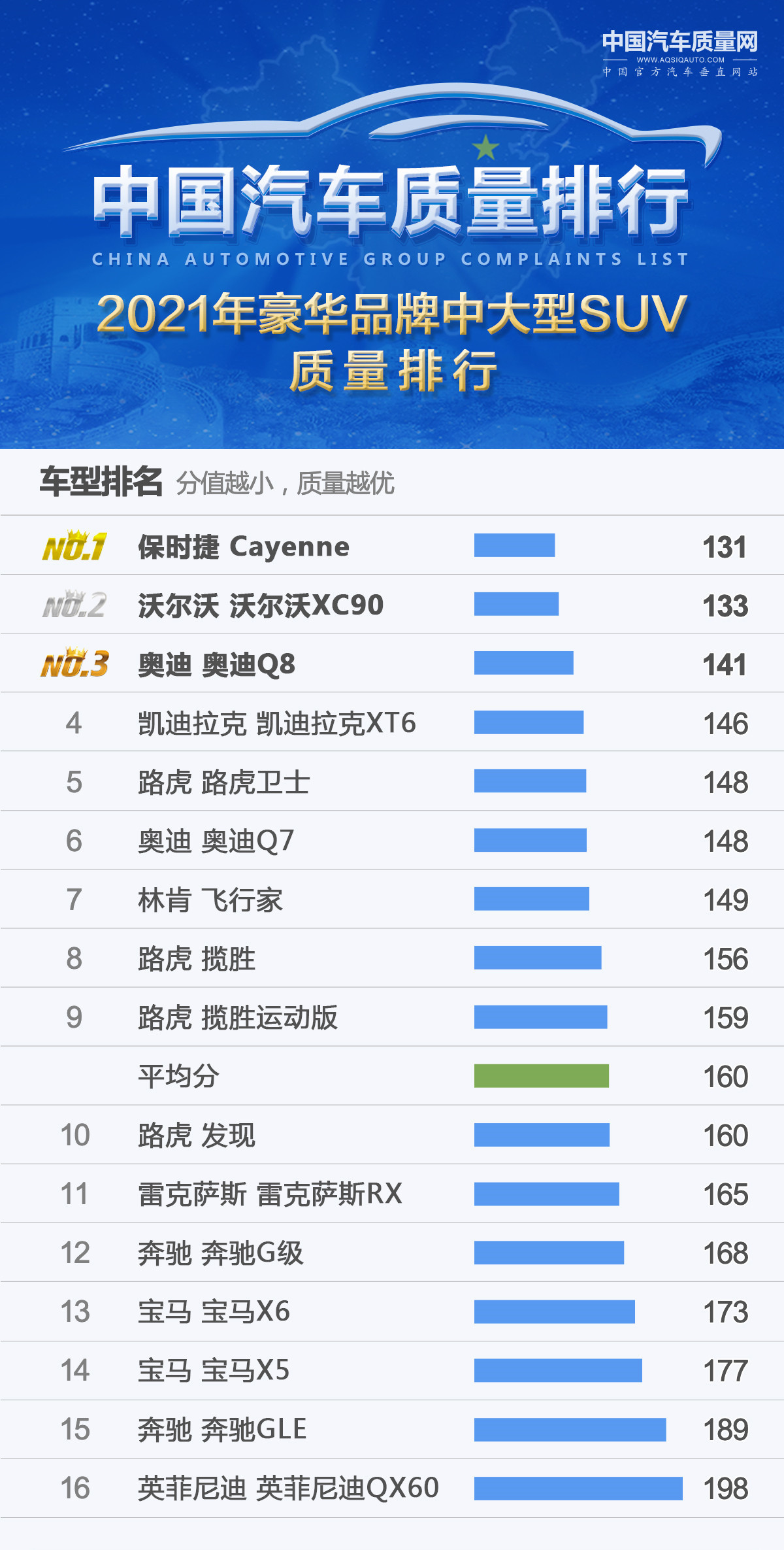 这次评选的平均分是160,其中,有9款车型成绩在平均值以上,还有7款车型的成绩在及格线以下。分数越小,代表质量越好。从榜单上可以看出,此次,拿下冠军的车型是保时捷Cayenne,这款车型综合评分只有131,排名第一。