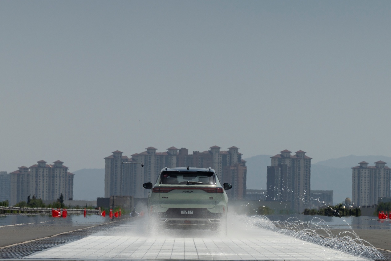 玄武岩和瓷砖路喷水测试体验,主要强调车辆在遇湿滑雨天路况时的操控稳定性。玄武岩路相比瓷砖路面行车会更稳定,底盘质感良好,抑制侧滑的情况也更优秀。