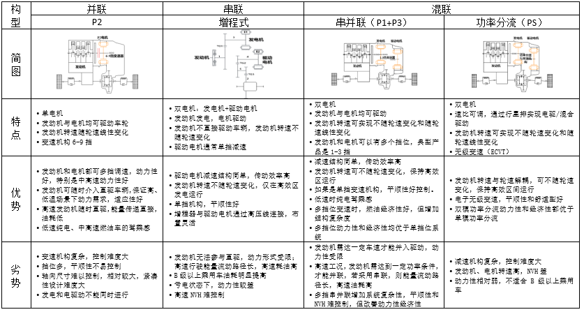 例如,串联构型无法实现并联下的工作模式,并联则无法实现串联的工作模式,而混联则具备串联和并联的特点,并且又分为:功率分流、串并联两种类型;但使用P13的串并联(P1和P3组合使用),发动机必须在一定车速条件下才可实现并联功能。