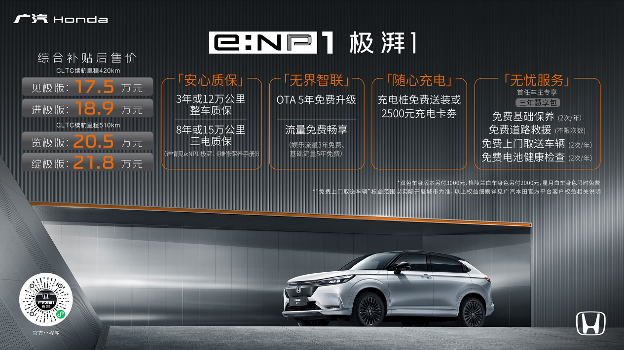 在购车权益方面,于2022年6月20日—2022年8月31日期间下定并后续交车的广汽本田e:NP1极湃1的用户,将享有以下权益:“安心质保”服务(3年或12万公里整车质保,及8年或15万公里三电质保)、“无界智联”服务(“OTA 5年免费升级”及“流量免费畅享”权益)、“随心充电”服务(充电桩免费送装或2500元充电卡券二选一)及“无忧服务”(首任车主专享的“三年慧享包”服务),广汽本田以诚意满满的权益政策,带给用户周到、专属的购车礼遇。