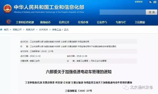 2018年11月8日,工业和信息化部、发改委等六部委联合印发《关于加强低速电动车管理的通知》,要求各地组织开展低速电动车清理整顿工作,严禁新增低速电动车产能,加强低速电动车规范管理。