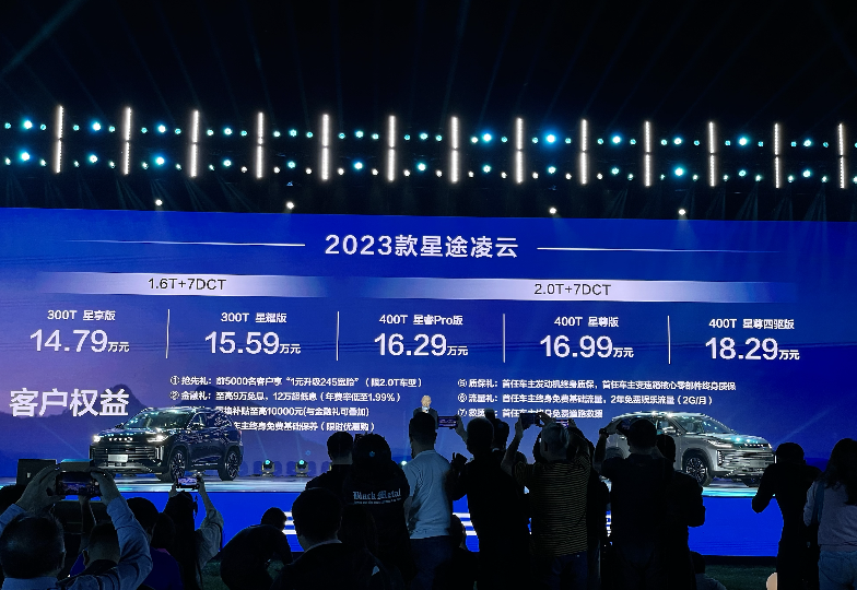 9月6日,2023款星途凌云正式上市,新车共推出5款车型,售价14.79万-18.29万元。同时还推出星途凌云S CCPC冠军版车型,售价15.29-17.25万元。
