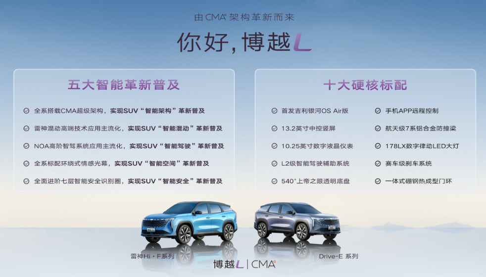 值得一提的是,博越L还是一款“入门即高配”的产品,全系拥有“十大硬核标配”:吉利银河OS Air版、13.2英寸中控竖屏、10.25英寸数字液晶仪表、L2级智能驾驶辅助系统、540°上帝之眼透明底盘、手机App远程控制、航天级7系铝合金防撞梁、178LX数字律动LED大灯、赛车级刹车系统和一体式硼钢热成型门环。