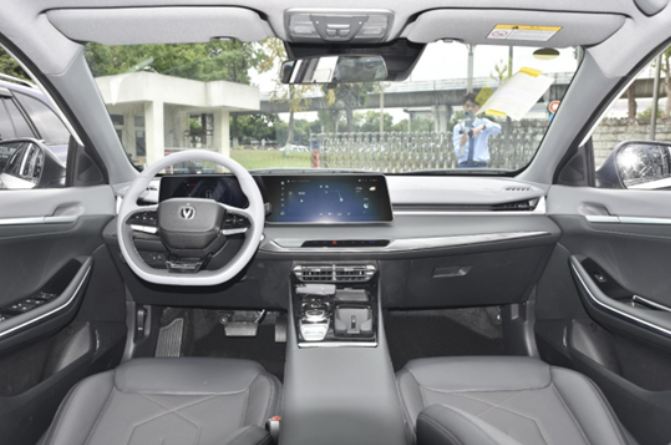 进入到车内,锐程PLUS使用了环抱式的中控台设计,并使用了分层式的结构,看起来简洁且富有层次感。与此同时,在做工用料部分也是达到了这个级别该有的水准,随手触及的区域均使用皮革进行覆盖,并且门板和仪表台加入了银色装饰进行点缀,带来更加出色的质感。在配置方面,配备了7英寸全液晶仪表+12.3英寸多媒体屏幕组合而成的双联屏设计,科技氛围出色。内置飞鱼2.5生态系统,界面UI简洁时尚,操作响应也比较跟手。