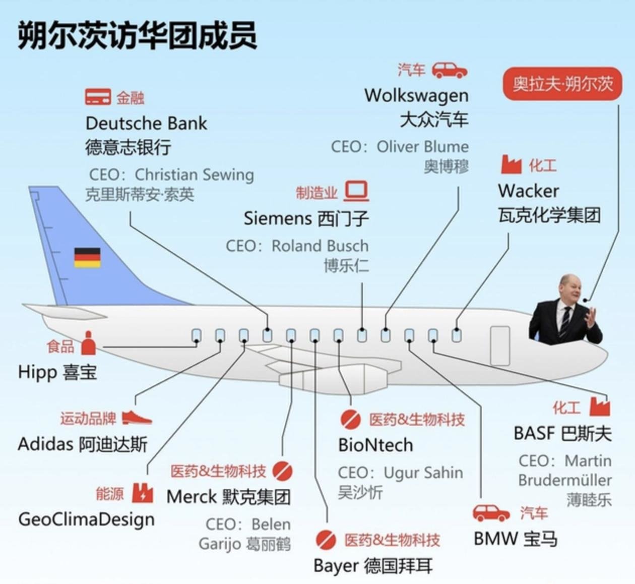 在此次访华中,除了朔尔茨本人的行程备受关注,跟随朔尔茨一同到来的高级企业领袖代表团也同样备受瞩目,其中包括大众、宝马、阿迪达斯、德意志银行、巴斯夫、西门子、喜宝、拜耳等十多家德国企业的高管。