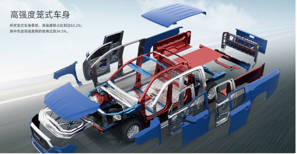 坑洼的郊野、川流不息的城市,唯有安全才是一辆皮卡最重要的品质。高占比的使用范围无疑是对车内乘客安全负责的一种直接体现。卡路里采用的高强度钢占比63.2%,其中高强度钢的使用达到34.5%,高强度钢的被动防护为车内人员筑起了最后一道安全防线。