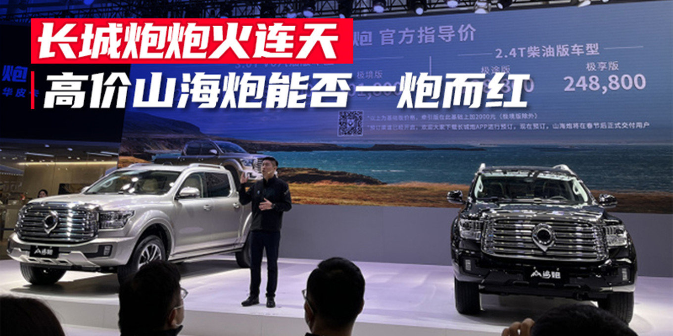 12月30日开幕的广州车展上,长城炮发布山海炮车型,新车推出搭载2.4T和3.0T两款动力系统版本,其中2.4T柴油版车型,售价区间为22.88万元-24.88万元,3.0T V6汽油版车型,售价区间为25.88万元-30.18万元。