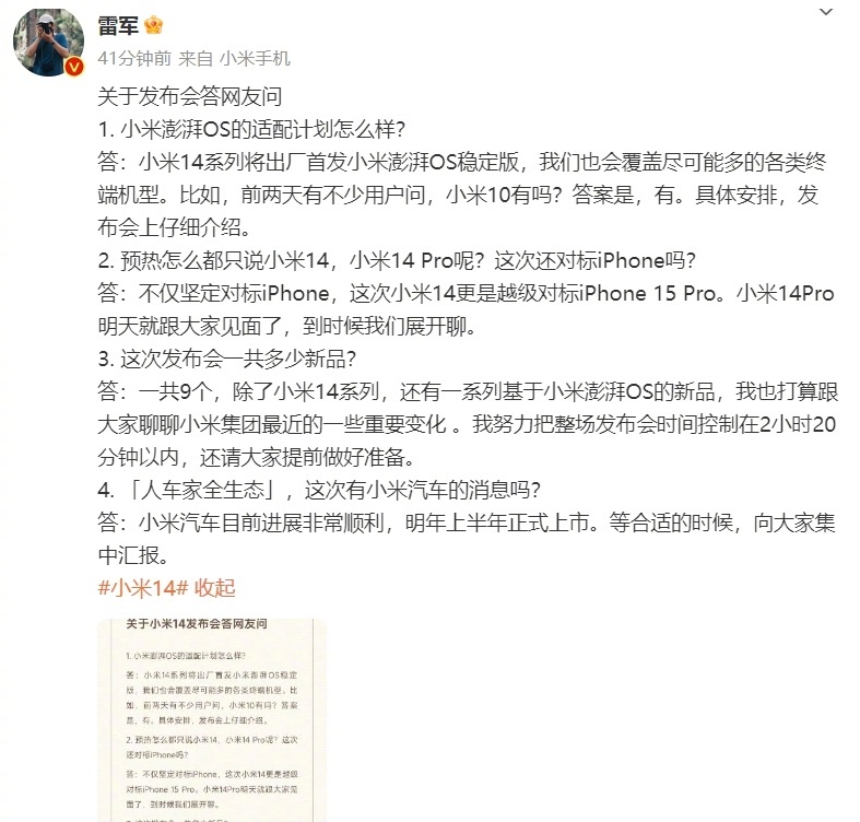雷军“答网友问”:小米汽车确定2024年上半年上市