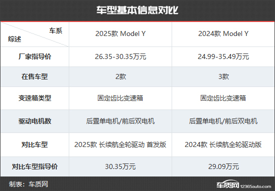 2025款特斯拉Model Y目前推出了2款首发版车型,相比2024款特斯拉Model Y少了1款车型。售价方面,新款车型的起售价比老款车型增加了1.36万元,顶配售价减少了5.14万元。本次对比分别选择了两款售价相近的车型,以便能够更加直观地看出新老款车型在配置层面的具体差异。