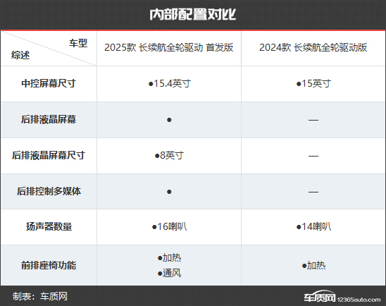 内部配置方面,新款车型的中控屏尺寸提升至15.4英寸,并且还增加了一个8英寸后排液晶屏幕,可以控制多媒体、玩游戏等。此外,新款车型还增加了前排座椅通风功能,能够进一步提升乘坐舒适性。