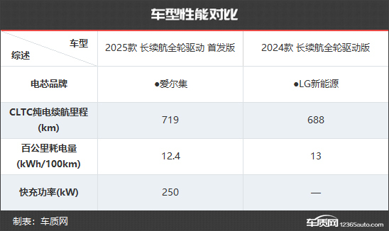 动力系统方面,新老款车型在电动机和电池参数上保持一致,有区别的是,新款车型采用了爱尔集电芯,CLTC纯电续航里程提升至719km,并且百公里电耗量也降低至12.4kWh/100km。