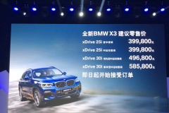 2018年4月26日,宝马官方在北京正式公布了华晨宝马X3的厂商指导价,新车与海外车型基本保持一致。将搭载2.0T高/低功率发动机,并匹配8速自动变速器。另外,新车全系标配xDrive四驱系统【详细】