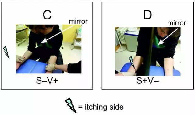 接下来,就可以见证“镜像挠痒法”的奇迹了!被这样挠过的被试们纷纷表示,自己事先被注射了少量组胺而痒个不停的右胳膊得到了明显的缓解。效果好极了(其实没有直接挠右胳膊好),鹅妹子嘤!而如果撤掉镜子,直接挠左边胳膊,就没有什么解痒效果了。