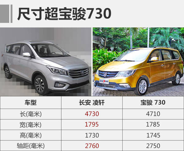 尺寸方面,长安全新MPV凌轩长宽高分别达到4730*1795*1730毫米,轴距为2760毫米。与同级别车型宝骏730相比,新车的长度方面超出了20毫米、宽度超出10毫米,轴距长出10毫米。