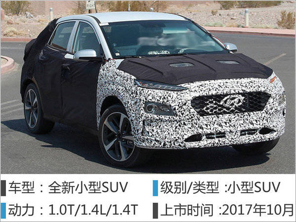 外媒曾经捕获了一组现代全新小型SUV的全伪装。新车前脸部分与2017款i30十分相似,前进气格栅采用银色蜂窝网状设计,车身尾部灯组采用了LED光源。动力方面,新车将与2017款i30共享动力配置,包括:1.0升涡轮增压发动机、1.4升涡轮增压和自然吸气发动机、1.6升柴油发动机。其中三款汽油发动机最大功率分别为87千瓦、102千瓦和71千瓦
