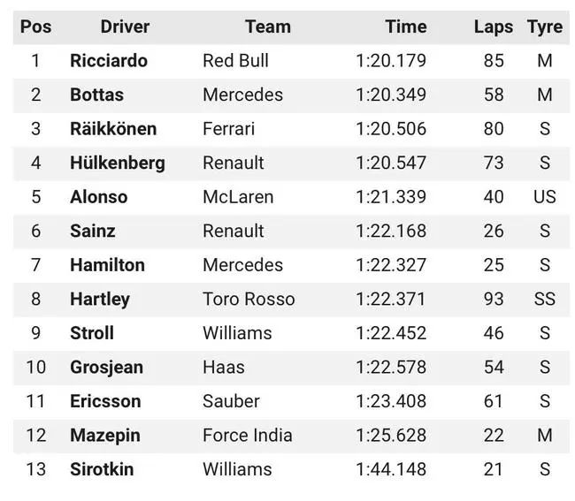 由于下午天降小雨,所有车手的最快圈速都来自上午。里卡多最快圈速为1分20秒179(中性胎),领先梅赛德斯车队博塔斯0.170秒(中性胎),领先法拉利车队莱科宁0.327秒(软胎)。雷诺车队霍肯伯格圈速第四,落后0.368秒(软胎)。