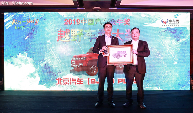 2019中国汽车金牛奖之越野车型大奖 北京汽车(BJ)40PLUS,颁奖者为:中国国际贸易促进委员会汽车行业分会、中国国际商会汽车行业商会会长,王侠,领奖者为:北京汽车销售有限公司副总经理彭刚。