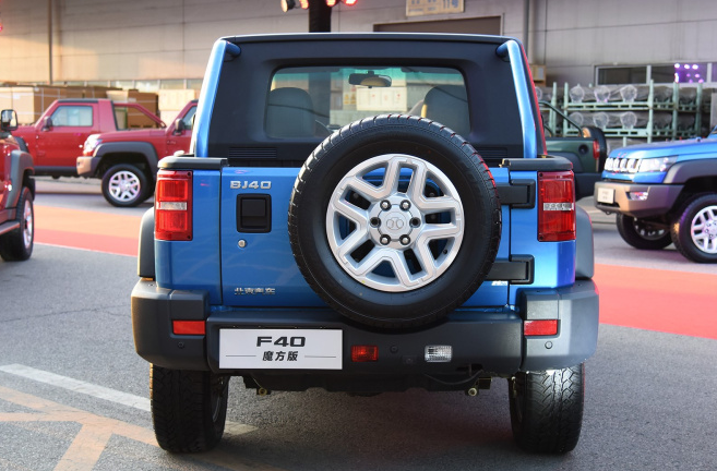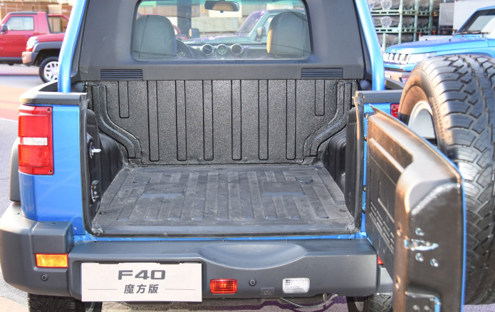 尾部有外观式的备胎,以及两根货箱架,设计比较别致,其实F40整体设计就是从BJ40上拆下了后排后备箱斗篷,确实是一车两用的经典设计。