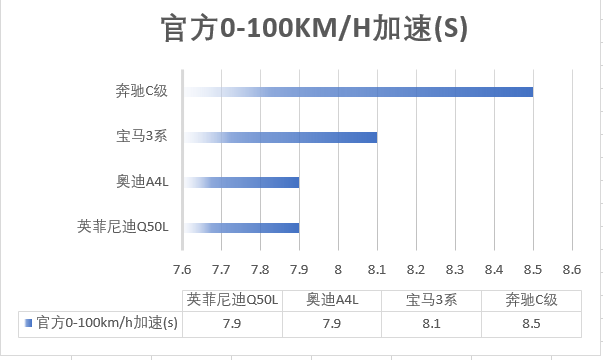 动力强不一定快,因为还有车重,变速箱是否可以承担更大扭矩等等因素,所以,要判断谁更快,最直接的还是对比0~100km/h的加速时间。这一点,两者不相伯仲,但Q50L还是略快一些,7.9秒破百,而325Li要8.1秒。